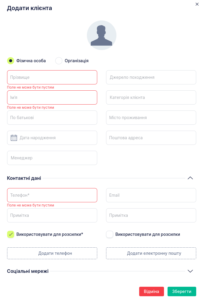*Перелік значень, які відображаються у випадаючому списку поля "Категорія клієнта" та "Джерело походження" формується та редагується у відповідному розділі ( див. Сегментування клієнтів)