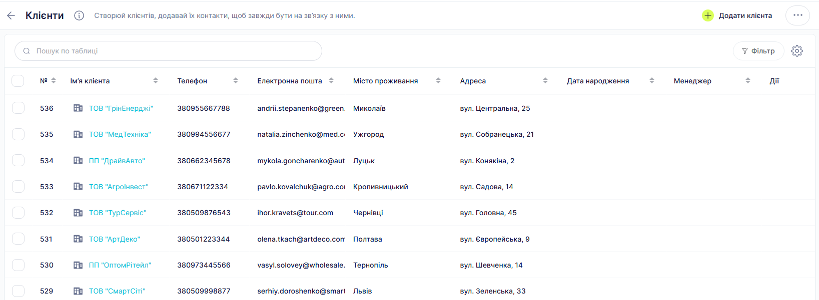 В каталозі клієнтів ми бачимо таблицю з переліком внесених в базу клієнтів: