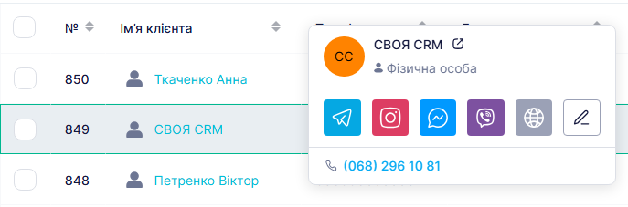 Щоб швидко переглянути контактну інформацію клієнта, достатньо навести курсор на його ім'я - через секунду з'явиться інформативна візитка :