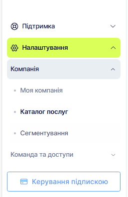 Навігація: перейдіть у розділ "Налаштування" - "Компанія" - "Каталог послуг" в бічному меню