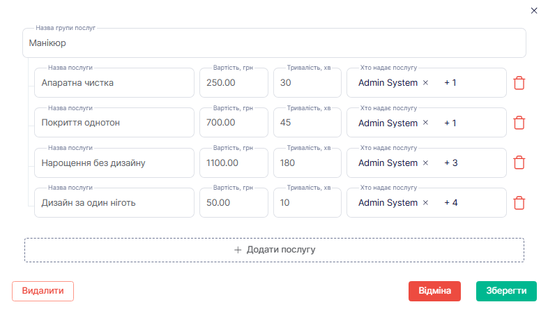 - Введіть назву групи (наприклад, "Манікюр", "Перукарські послуги")