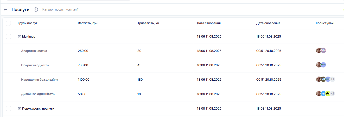 Групи послуг — це категорії, які об'єднують схожі послуги за типом або напрямком роботи. Вони працюють як папки в системі, допомагаючи структурувати ваш прайс-лист. Наприклад, у салоні краси можуть бути такі групи: "Манікюр", "Педикюр", "Перукарські послуги", "Косметологія".