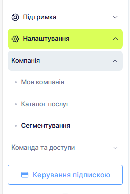 Перейдіть у розділ Налаштування - група Компанія - закладка Сегментування ( в бічному меню)